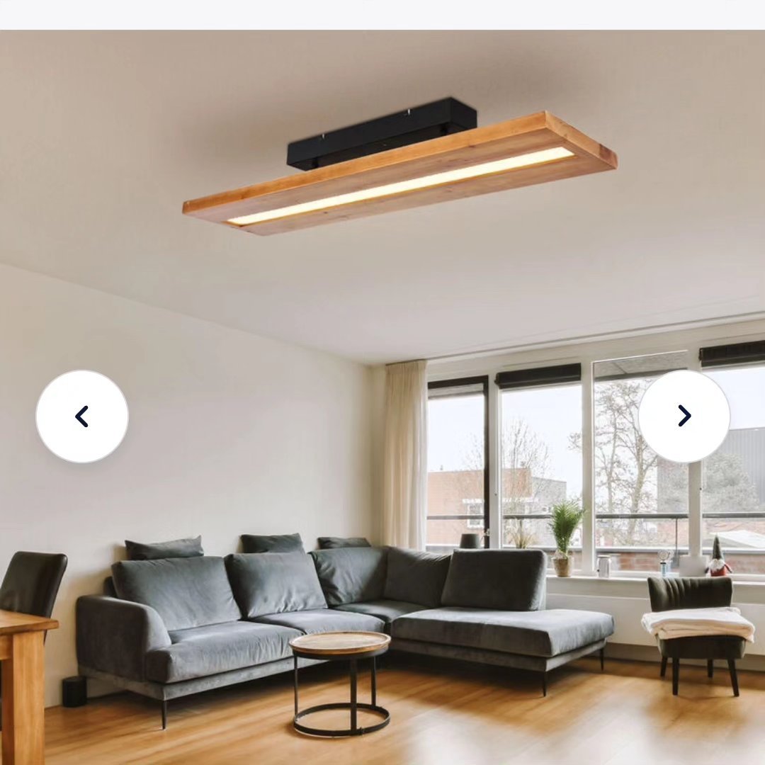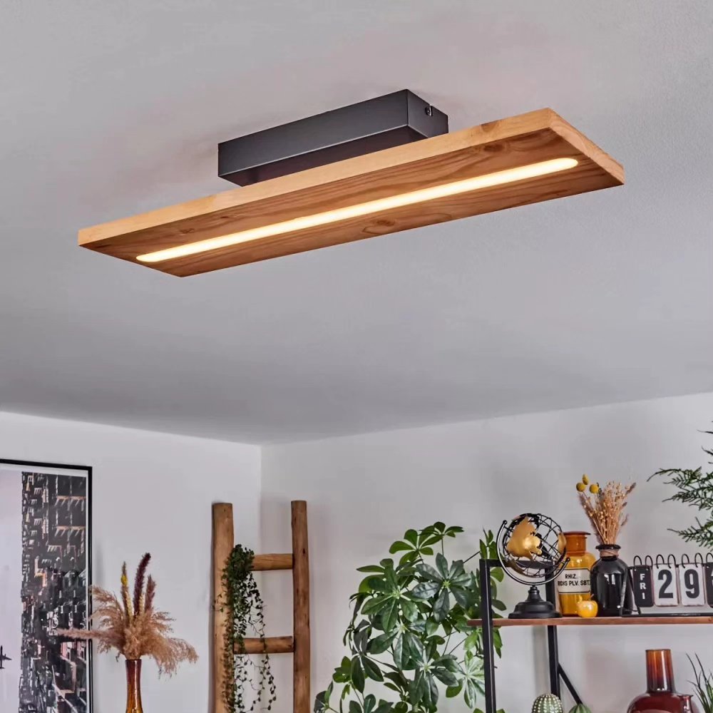 Plafonnier LED design moderne scandinave, en bois et métal brut, variateur intégré.