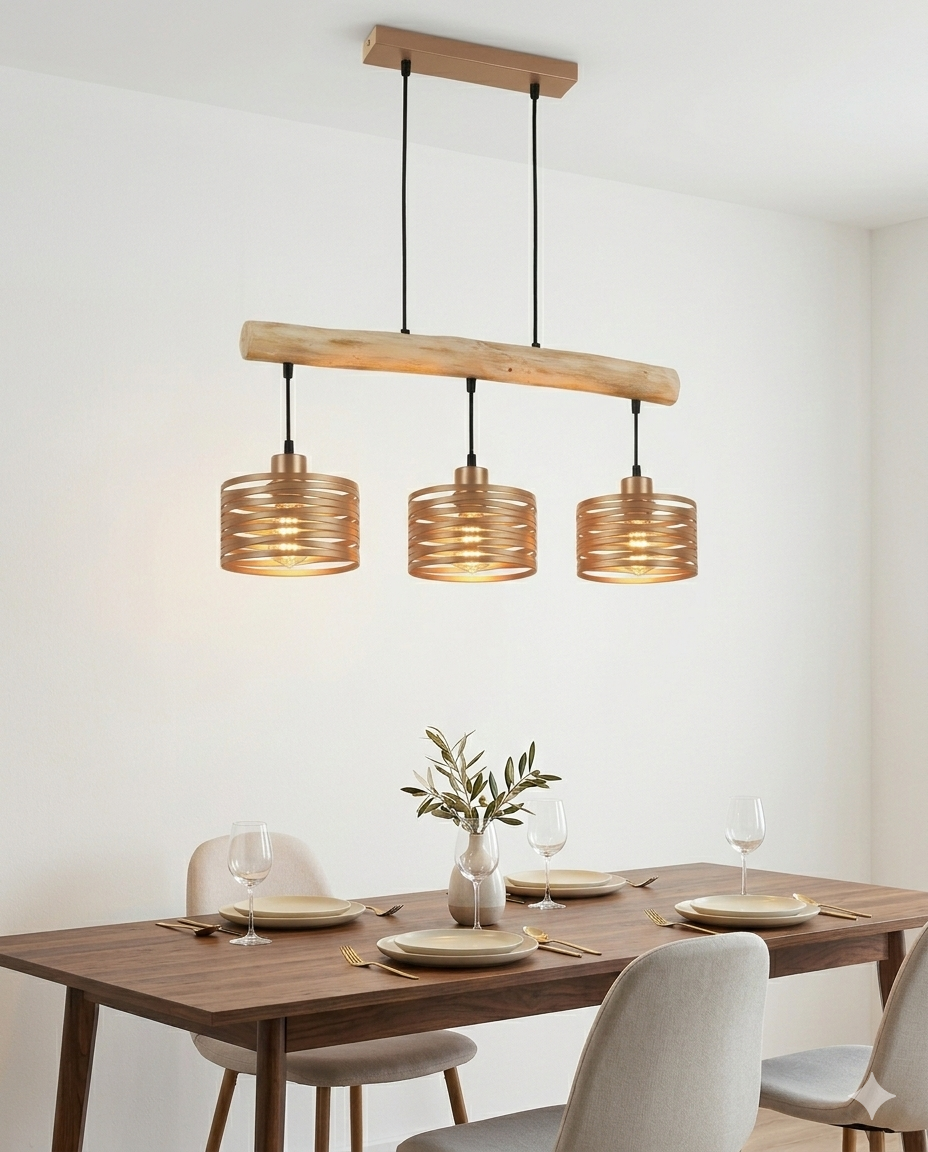 Avec ses dimensions généreuses de 70 cm de large et sa hauteur ajustable de 120 cm, la suspension Capucino est idéale au-dessus d’une table de salle à manger ou d’un îlot de cuisine. Elle s’intègre parfaitement dans un décor scandinave, bohème-chic ou contemporain, où l’éclairage chaleureux des ampoules à filament visible met en valeur la beauté naturelle du bois et l’éclat délicat de l’or poudré.